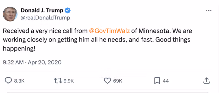 Prezydent Trump – będący wówczas w fazie pandemii „wysłania wszystkim kontroli” – tak naprawdę pochwalił gubernatora Walza i opublikował nietypowo miły tweet.