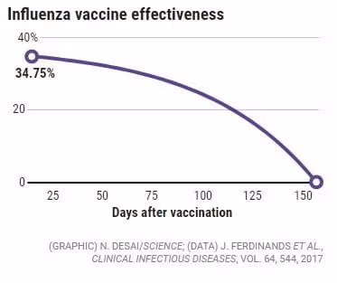 Na początku szczepionka przeciw grypie jest skuteczna tylko w około 40%. I zaczyna zanikać niemal natychmiast po szczepieniu. Po około 150 dniach (5 miesięcy) osiąga zero.