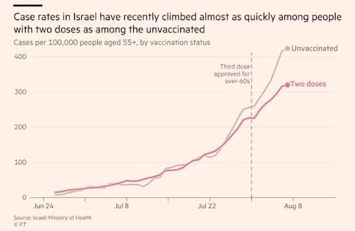 Źródło: "Izrael ma nadzieję, że dopalacze mogą zapobiec nowej blokadzie, gdy skuteczność szczepionek przeciw COVID słabnie.” 23 sierpnia 2021, Financial Times,