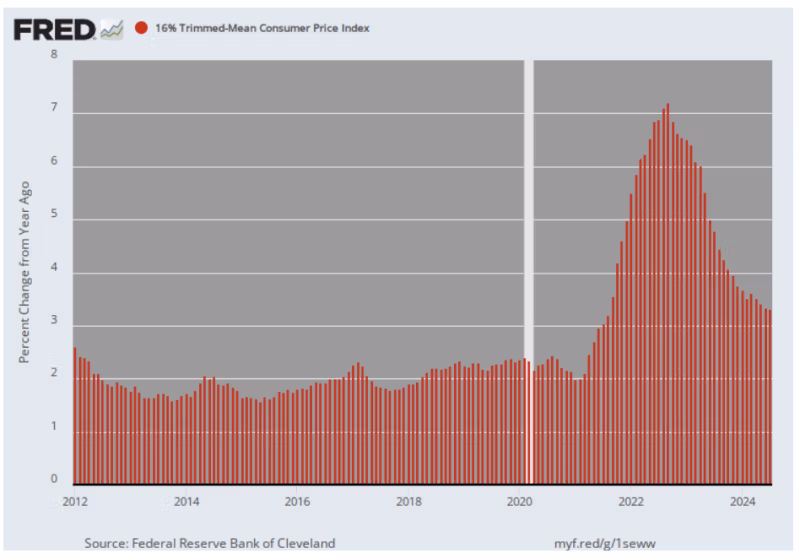 Oto wynik błędnej proinflacyjnej polityki Fed od chwili oficjalnego przyjęcia celu na poziomie 2.00% w styczniu 2012 r. Według naszego sprawdzonego średniego obciętego CPI na poziomie 16%, poziom cen wzrósł o + 41% od tego czasu i według publikacji CPI z tego tygodnia w dalszym ciągu rosła w tempie 3.31% rocznie.