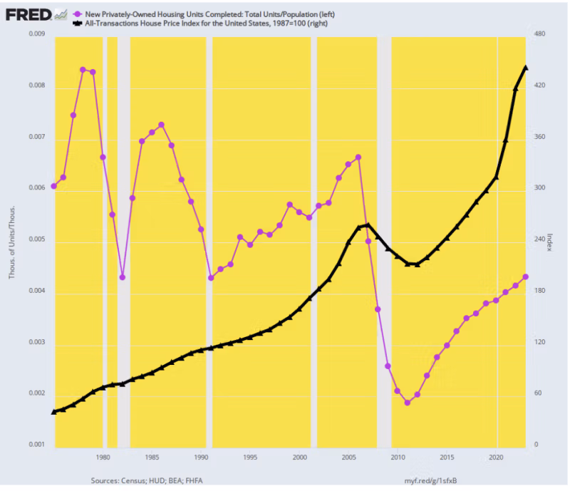 Liczba oddanych mieszkań na mieszkańca a ceny mieszkań, 1987–2023