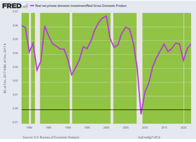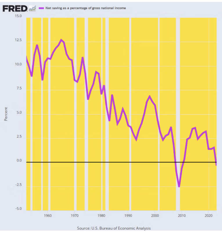Oczywiście suma tych dwóch elementów pozostaje na inwestycje w produktywność i wzrost, wykraczające poza reinwestycje ulg w bieżącym okresie na zużycie kapitału (tj. amortyzację). Jak wyraźnie widać na poniższym wykresie, to, co obecnie pozostało, wcale nie jest kwotą netto – drastyczny spadek z poziomu stopy oszczędności netto wynoszącej 7% do 12% PKB, która dominowała w okresie rozkwitu dobrobytu na Main Street.