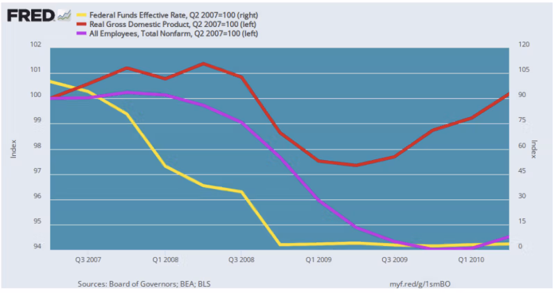 Oto, co wydarzyło się w okresie Wielkiej Recesji. Fed zaczął obniżać ówczesną stopę funduszy federalnych wynoszącą 5.25% (żółta linia) w trzecim kwartale 2007 r., a rok później, w czwartym kwartale 4 r., zasadniczo obniżyła ją do 2008 punktów bazowych. Oznaczało to 10% obniżkę i najbardziej radykalną i najszybszą sekwencję obniżek stóp procentowych w całej historii Fed. Z daleka.